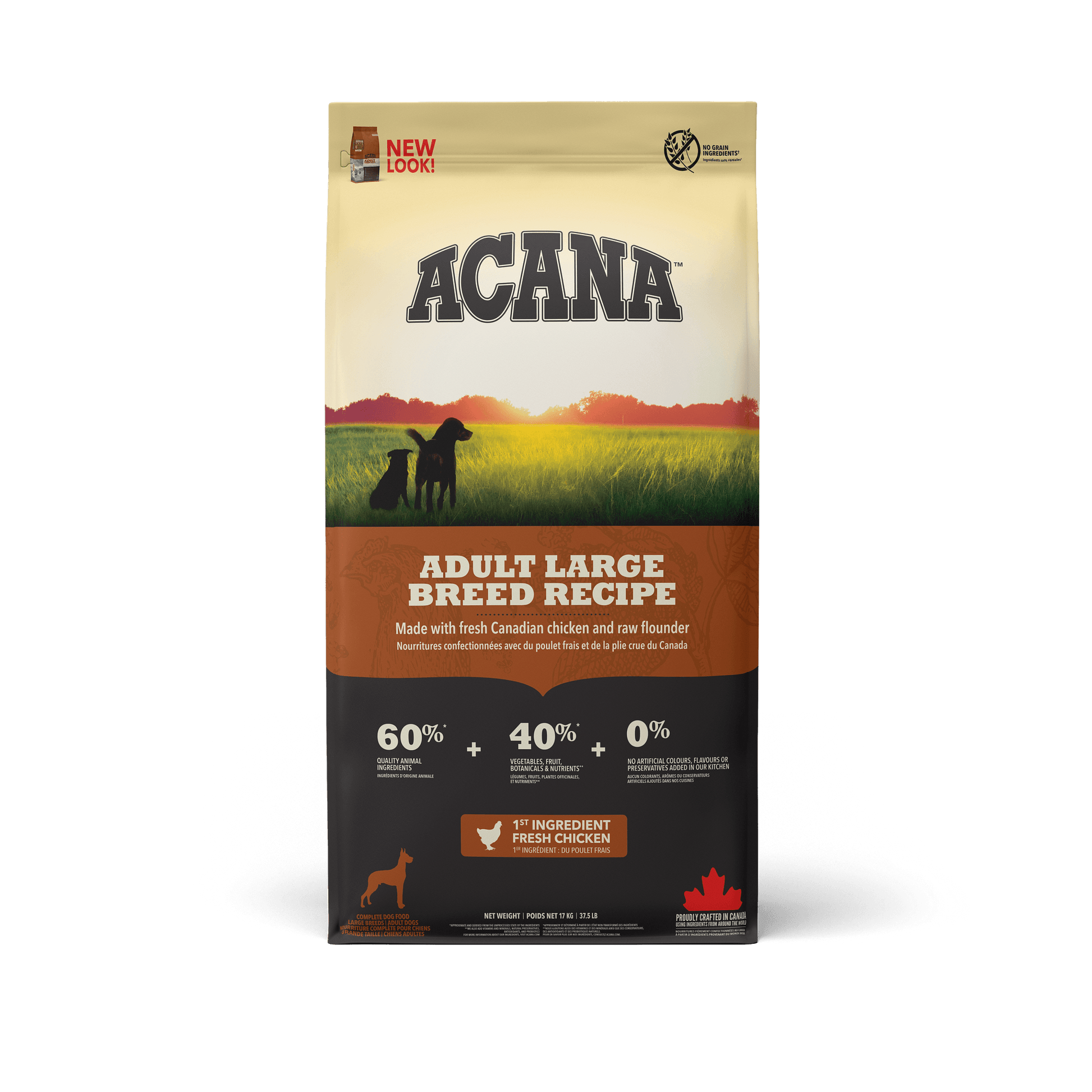 Acana Dog Adult Large Breed provides essential nutrition for large-breed dogs. Each meal contains 60% quality animal ingredients, including fresh Canadian chicken and raw flounder, and 40% fruit, vegetables, and botanicals in a delicious balance. It's the perfect way to keep your large-breed canine healthy and active.